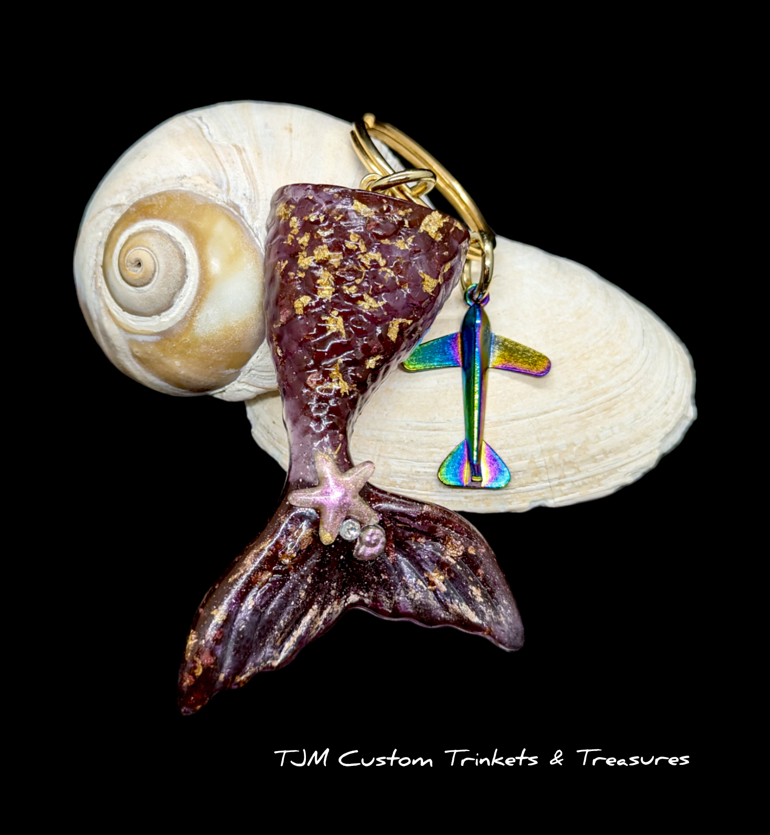 Resin mermaid tail (purple tint and gold flakes) with airplane charm